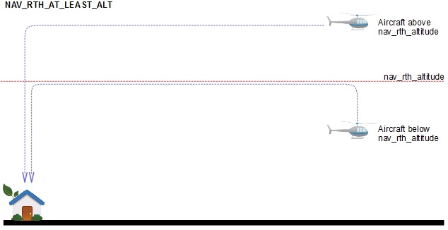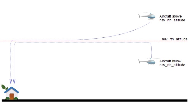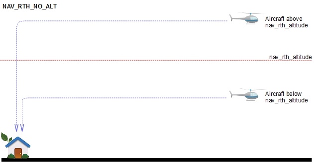 - nav_rth_altitude defines the minimum RTH altitude above launch point. If the maximum altitude of the flight is below nav_rth_altitude, nav_rth_altitude is used. If the maximum altitude of the flight is above nav_rth_altitude, the maximum altitude is used. 0 = disabled.